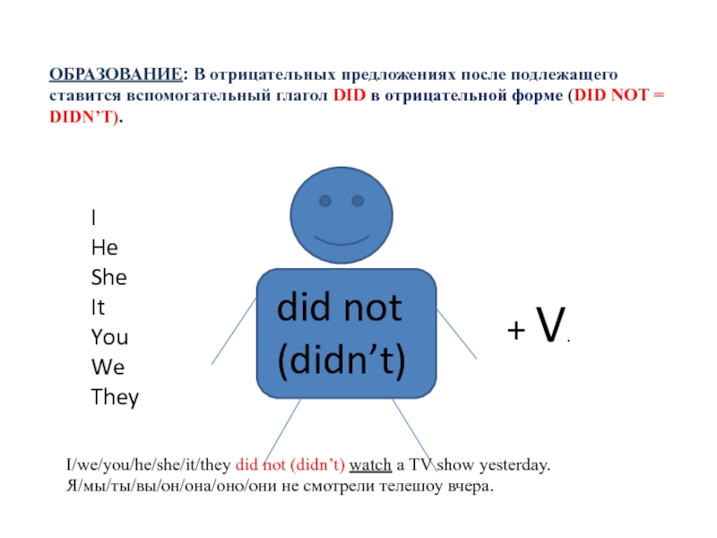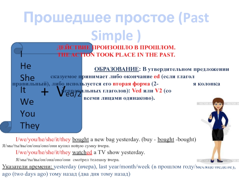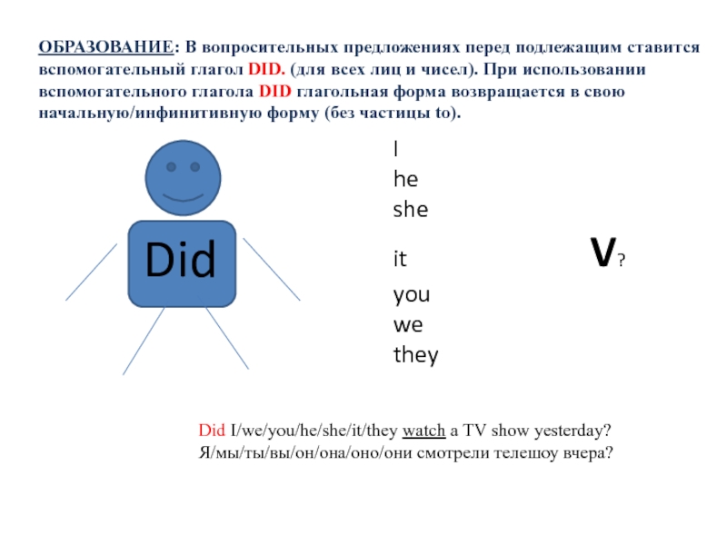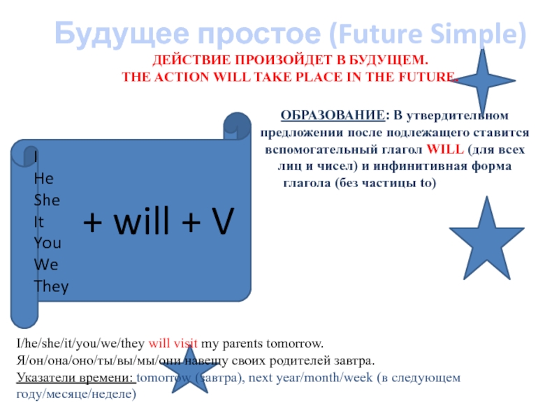 ОБРАЗОВАНИЕ: В утвердительных предложениях форма Present Simple совпадает с основой глагола во всех лицах, кроме 3 лица ед.ч., где прибавляется окончание –s/es.