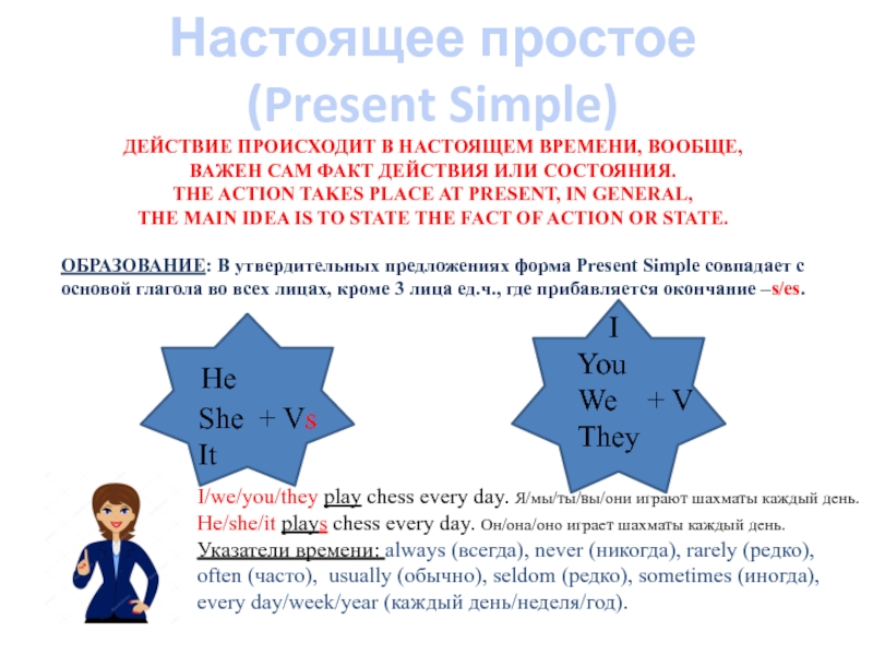 Указатели времени: always (всегда), never (никогда), rarely (редко), often (часто), usually (обычно), seldom (редко), sometimes (иногда), every day/week/year (каждый день/неделя/год).