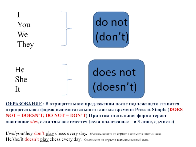 I/we/you/they play chess every day. Я/мы/ты/вы/они играют шахматы каждый день.
