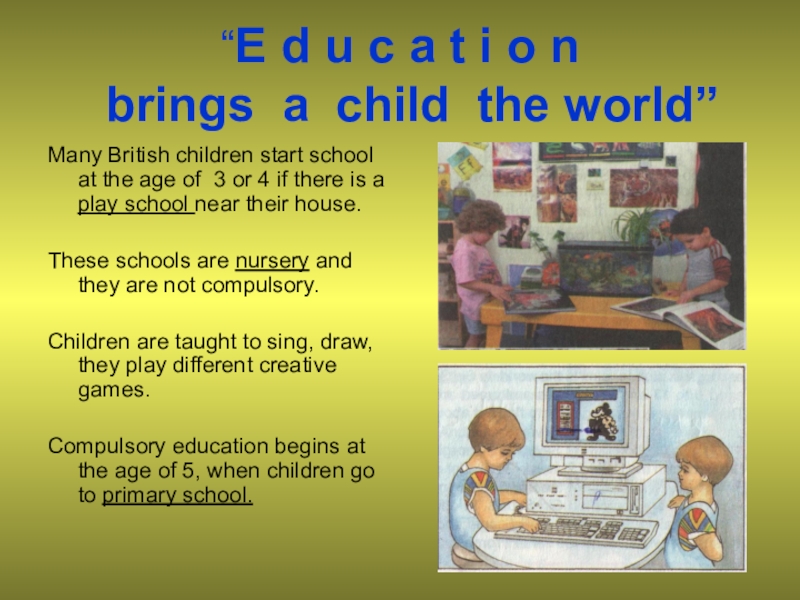 Compulsory education begins at the age of 5, when children go to primary school.