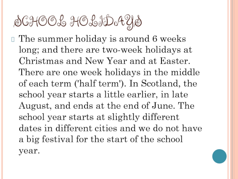 SCHOOL HOLIDAYSThe summer holiday is around 6 weeks long; and there are two-week holidays at Christmas and