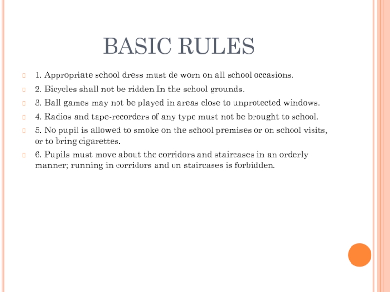 BASIC RULES1. Appropriate school dress must de worn on all school occasions.2. Bicycles shall not be ridden In the school grounds.3. Ball games may not be played in areas close to unprotected windows.4. Radios and tape-recorders