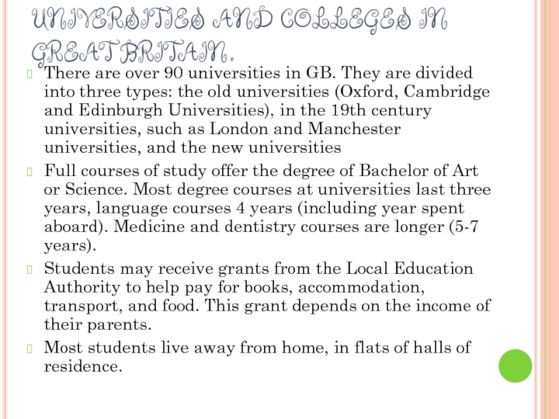 GB. They are divided into three types: the old universities (Oxford, Cambridge and Edinburgh Universities), in the 19th century universities, such as London and Manchester universities, and the new universities