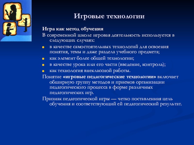 Понятие «игровые педагогические технологии» включает обширную группу методов и приемов организации педагогического процесса в форме различных педагогических игр.