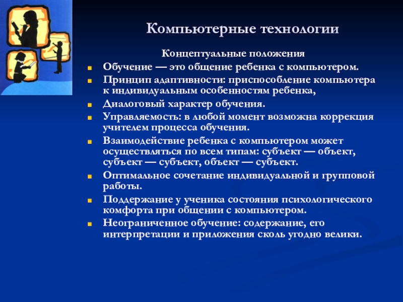 Компьютерные технологии развивают идеи программированного обучения; открывают совершенно новые технологические варианты обучения, связанные с уникальными возможностями современных компьютеров и телекоммуникаций.