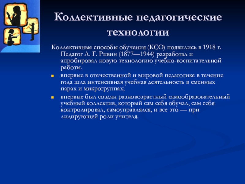 Коллективные способы обучения (КСО) появились в 1918 г. Педагог