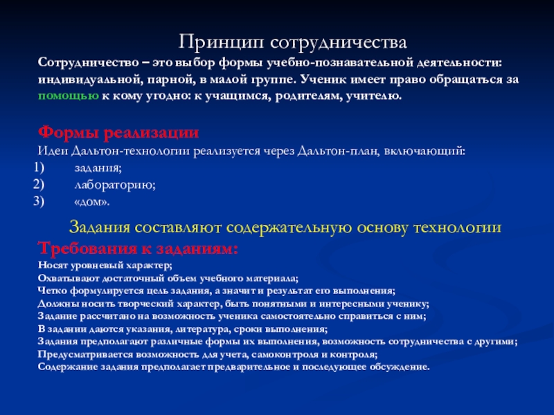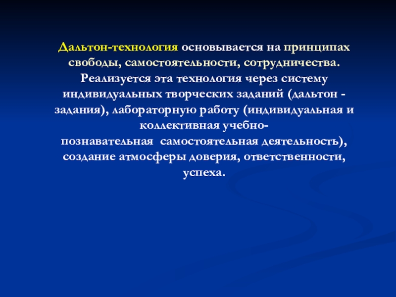 Слайд 15Дальтон-технология основывается на принципах свободы, самостоятельности, сотрудничества. Реализуется эта технология через