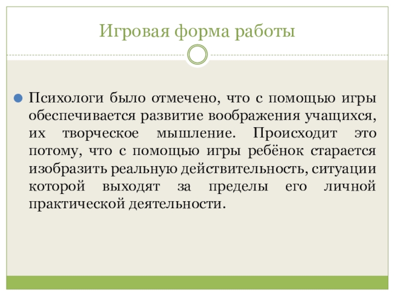 воображения учащихся, их творческое мышление. Происходит это потому, что с помощью игры ребёнок старается изобразить реальную действительность, ситуации которой выходят за пределы его личной практической деятельности.