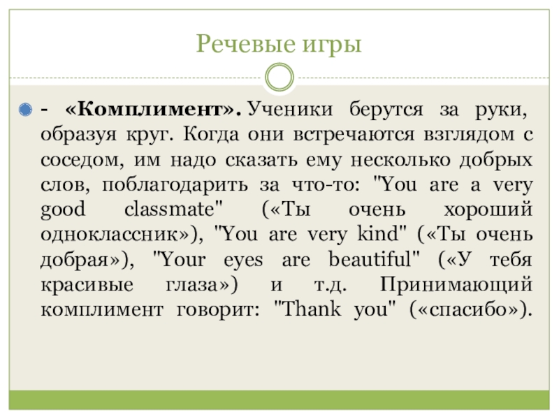 взглядом с соседом, им надо сказать ему несколько добрых слов, поблагодарить за что-то: "You are a very good classmate" («Ты очень хороший одноклассник»), "You are very kind" («Ты очень добрая»), "Your eyes are beautiful" («У тебя красивые глаза») и т.д. Принимающий комплимент говорит: "Thank you" («спасибо»).