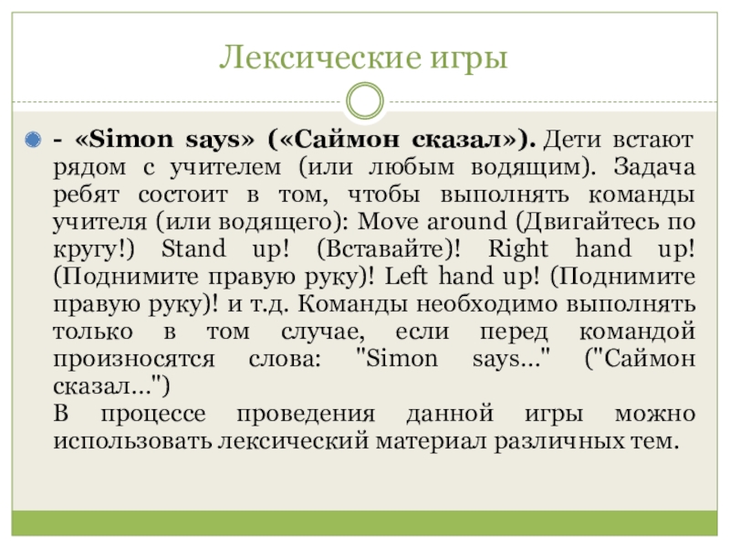 (или любым водящим). Задача ребят состоит в том, чтобы выполнять команды учителя (или водящего): Move around (Двигайтесь по кругу!) Stand up! (Вставайте)! Right hand up! (Поднимите правую руку)! Left hand up! (Поднимите правую руку)! и т.д. Команды необходимо выполнять только в том случае, если перед командой произносятся слова: "Simon says…" ("Саймон сказал…")