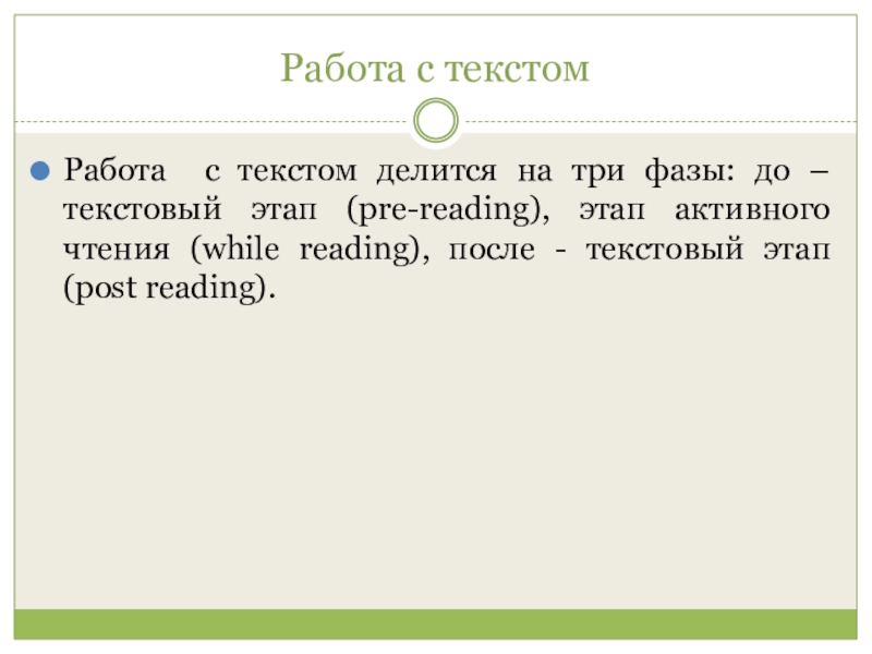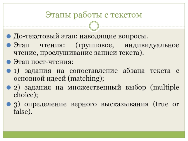 текстовый этап (pre-reading), этап активного чтения (while reading), после - текстовый этап (post reading).