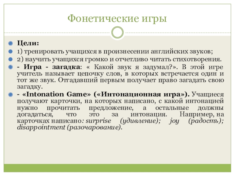 - «Intonation Game» («Интонационная игра»). Учащиеся получают карточки, на которых написано, с какой интонацией нужно прочитать предложение, а остальные должны догадаться, что это за интонация. Например, на карточках написано: surprise (удивление); joy (радость); disappointment (разочарование).