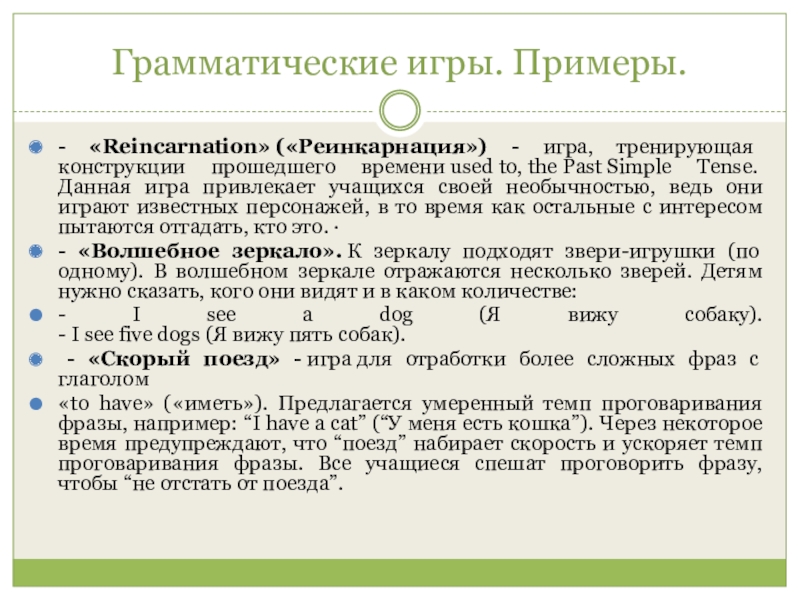 - «Reincarnation» («Реинкарнация») - игра, тренирующая конструкции прошедшего времени used to, the Past Simple Tense.