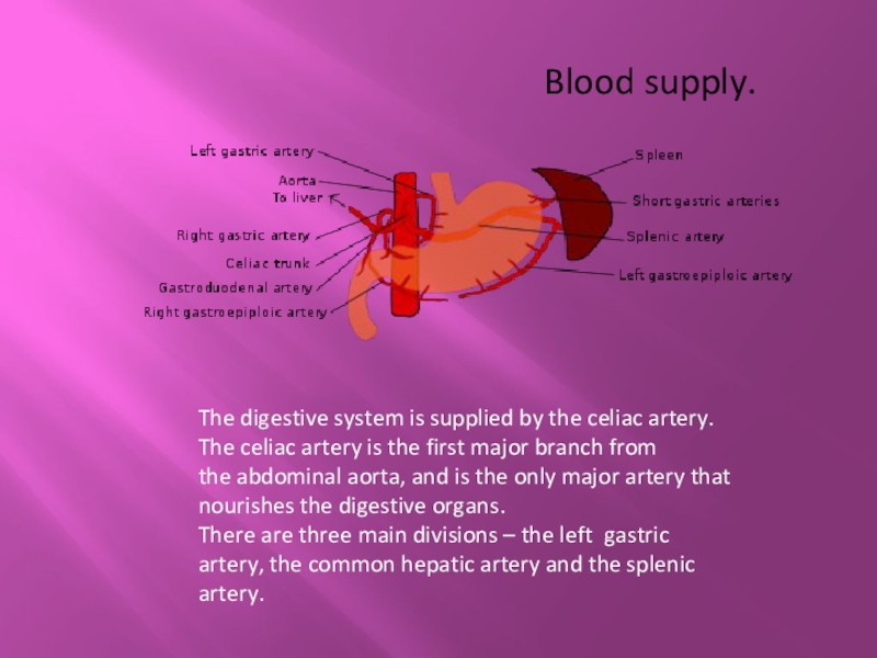 There are three main divisions – the left gastric artery, the common hepatic artery and the splenic artery.