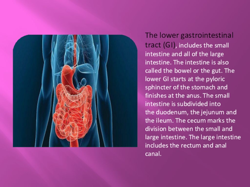 Слайд 15The lower gastrointestinal tract (GI), includes the small intestine and all of the large