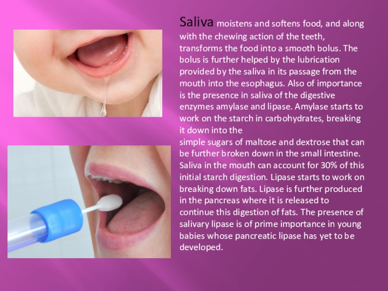 Слайд 5Saliva moistens and softens food, and along with the chewing action of