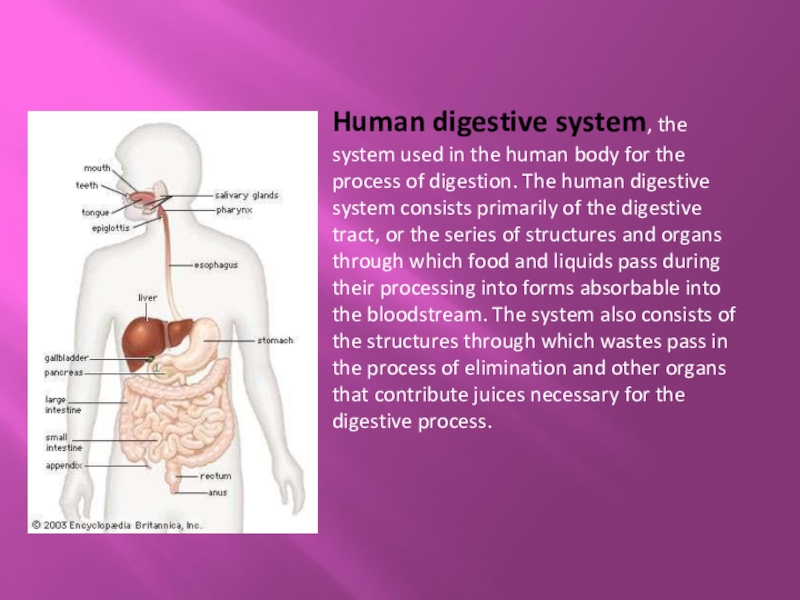 of digestion. The human digestive system consists primarily of the digestive tract, or the series of structures and organs through which food and liquids pass during their processing into forms absorbable into the bloodstream. The system also consists of the structures through which wastes pass in the process of elimination and other organs that contribute juices necessary for the digestive process.