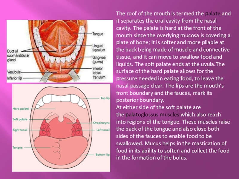 Слайд 4The roof of the mouth is termed the palate and it separates the