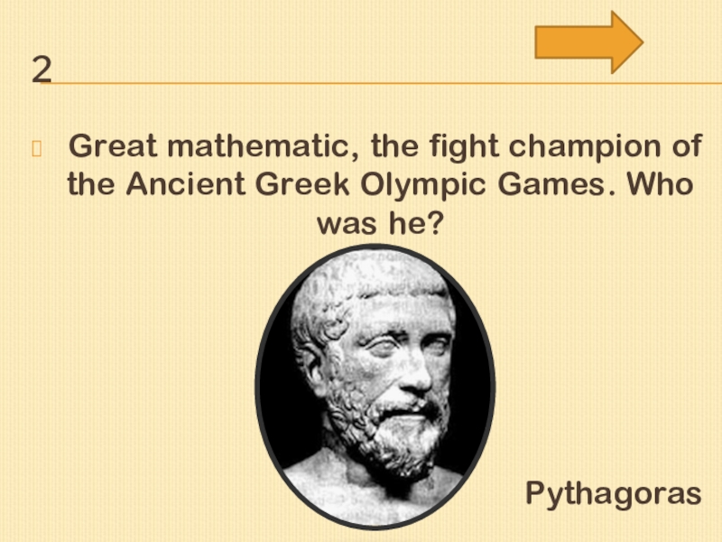 2 	Great mathematic, the fight champion of the Ancient Greek Olympic Games. Who was he?Pythagoras
