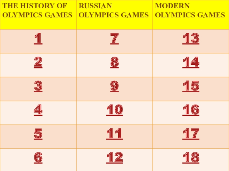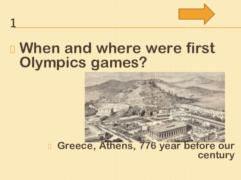 1When and where were first Olympics games?Greece, Athens, 776 year before our century