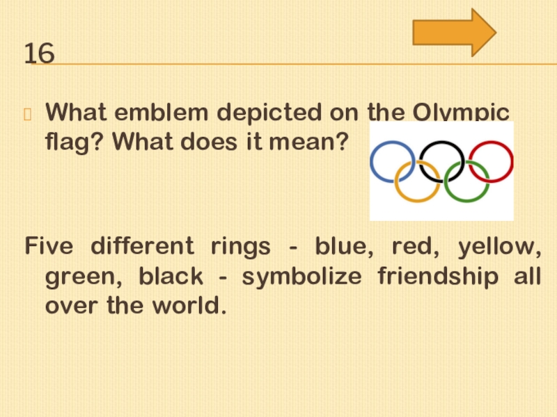 16What emblem depicted on the Olympic flag? What does it mean? Five different rings - blue, red, yellow,