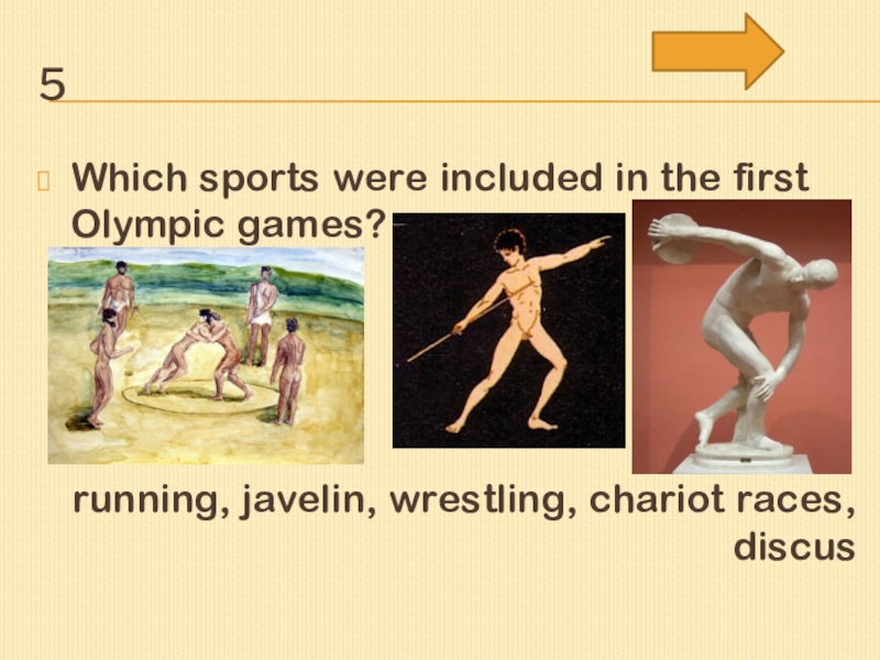 5Which sports were included in the first Olympic games?running, javelin, wrestling, chariot races, discus