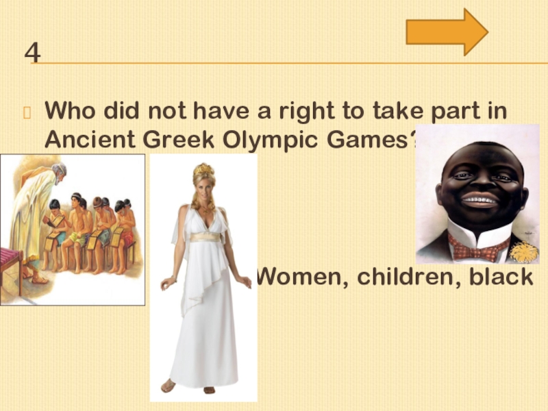 4Who did not have a right to take part in Ancient Greek Olympic Games?Women, children, black