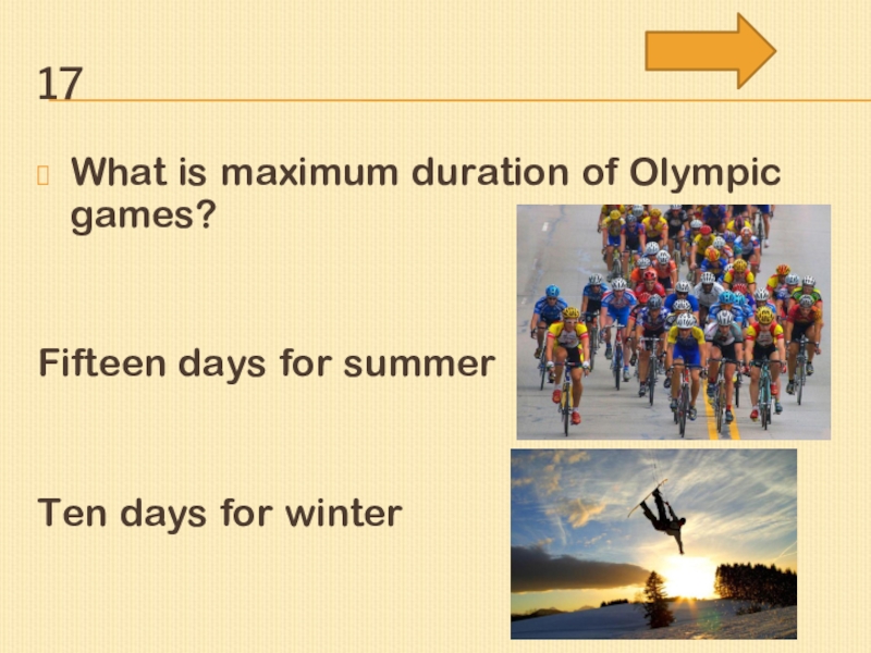 17What is maximum duration of Olympic games?Fifteen days for summerTen days for winter