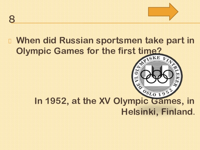 8When did Russian sportsmen take part in Olympic Games for the first time? In 1952, at the XV