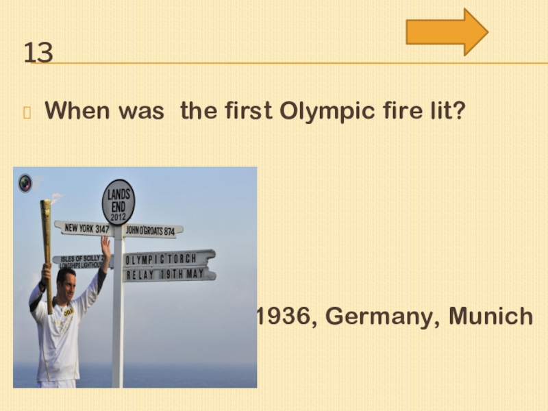 13When was the first Olympic fire lit?1936, Germany, Munich