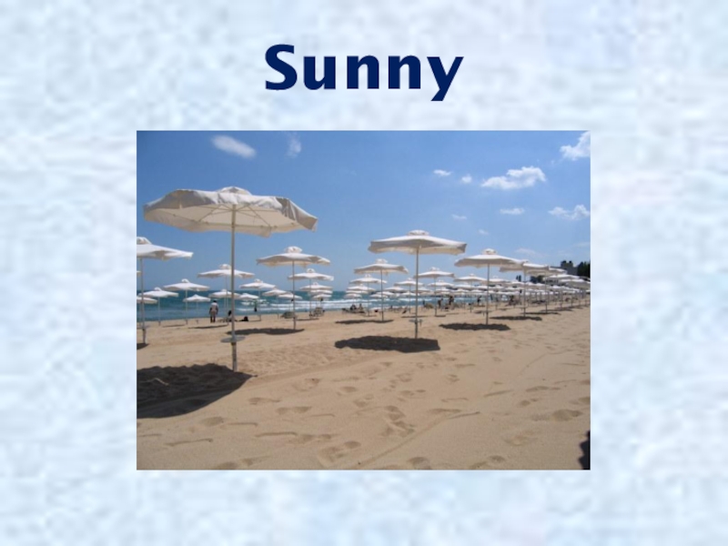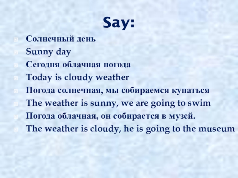 Say:Солнечный деньSunny dayСегодня облачная погодаToday is cloudy weatherПогода солнечная, мы собираемся купатьсяThe weather is sunny, we are