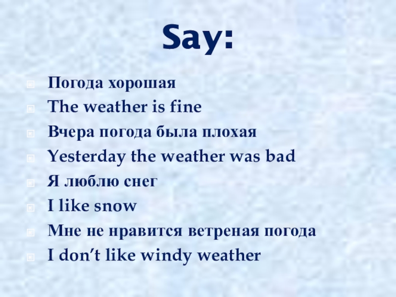 Say:Погода хорошая The weather is fineВчера погода была плохаяYesterday the weather was badЯ люблю снегI like snowМне