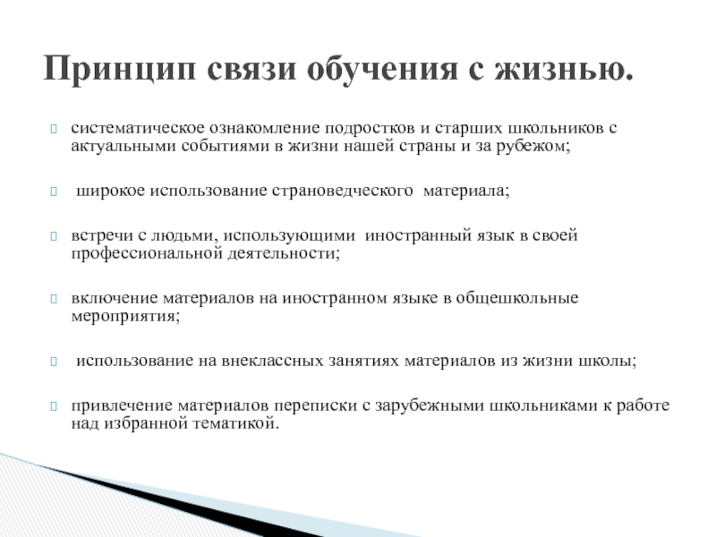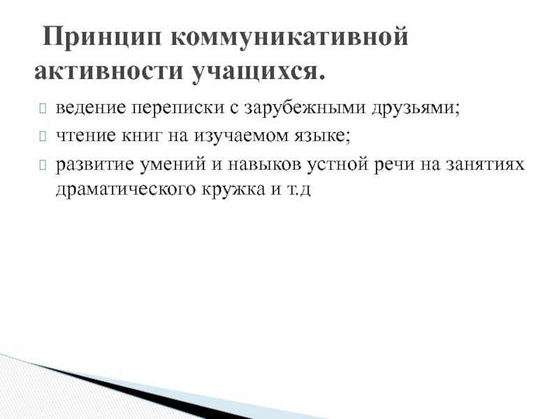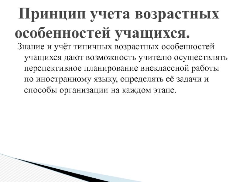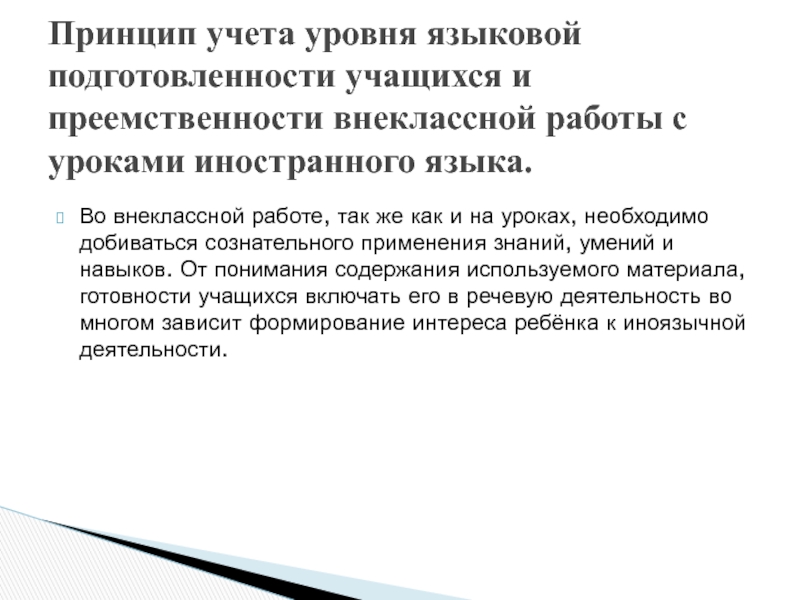 Принцип учета уровня языковой подготовленности учащихся и преемственности внеклассной работы с уроками иностранного языка.
