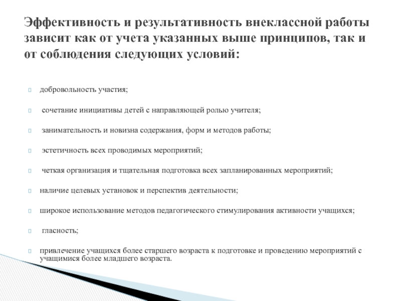 Эффективность и результативность внеклассной работы зависит как от учета указанных выше принципов, так и от соблюдения следующих условий: