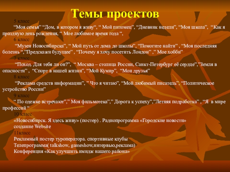 “Реклама средств информации”, ” Что я читаю”, “Мой любимый писатель”, “Политическое устройство России”
