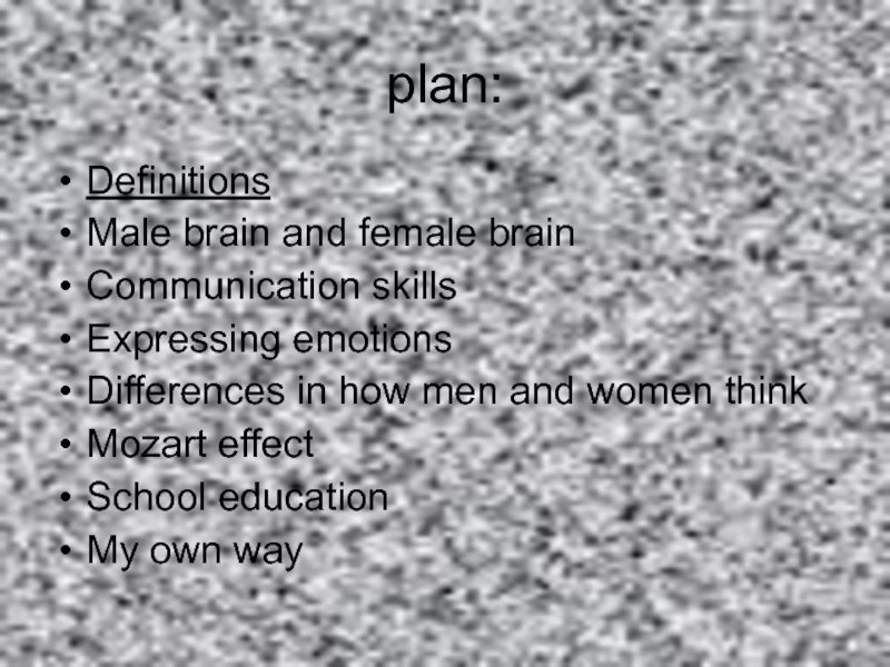 plan:DefinitionsMale brain and female brainCommunication skillsExpressing emotionsDifferences in how men and women thinkMozart effectSchool educationMy own way