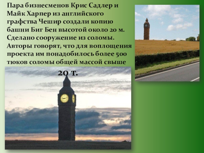 создали копию башни Биг Бен высотой около 20 м. Сделано сооружение из соломы. Авторы говорят, что для воплощения проекта им понадобилось более 500 тюков соломы общей массой свыше 20 т.