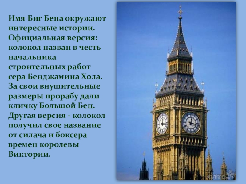 Слайд 15Имя Биг Бена окружают интересные истории. Официальная версия: колокол назван в