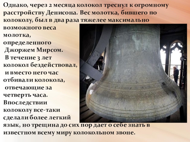 Слайд 8Однако, через 2 месяца колокол треснул к огромному расстройству Денисона. Вес