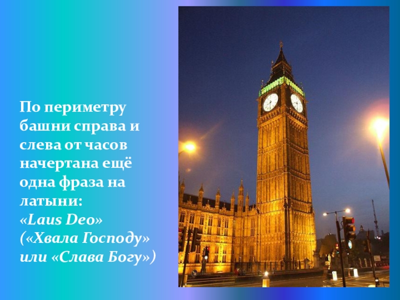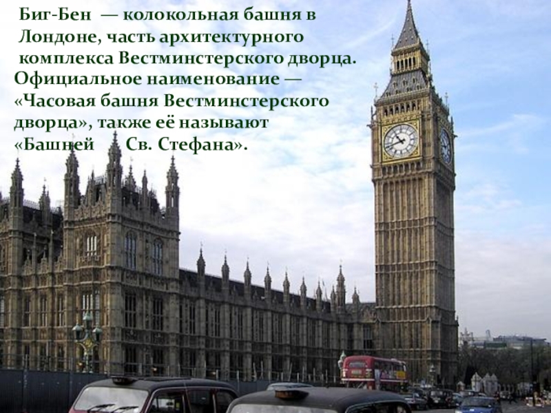 Слайд 2Биг-Бен — колокольная башня в Лондоне, часть архитектурного комплекса Вестминстерского дворца.