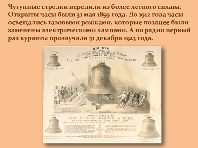 Слайд 9Чугунные стрелки перелили из более легкого сплава. Открыты часы были 31