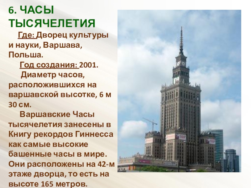 Варшавские Часы тысячелетия занесены в Книгу рекордов Гиннесса как самые высокие башенные часы в мире. Они расположены на 42-м этаже дворца, то есть на высоте 165 метров.