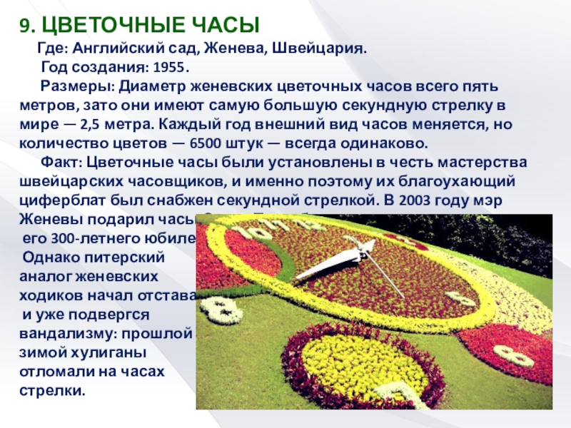 Факт: Цветочные часы были установлены в честь мастерства швейцарских часовщиков, и именно поэтому их благоухающий циферблат был снабжен секундной стрелкой. В 2003 году мэр Женевы подарил часы Санкт-Петербургу в честь
