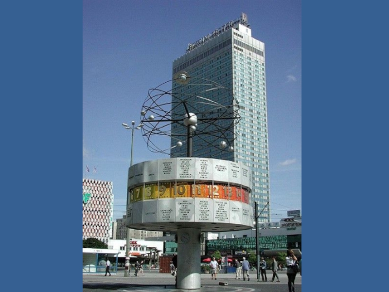 Часы были построены в ходе социалистической перестройки Александерплац, которая в то время располагалась в восточной части Берлина. Поэтому в 24 сегментах цилиндра написаны прежде всего столицы соцстран, от Пекина до Гаваны. Пол под часами выложен мозаикой, изображающей розу ветров. А над цилиндром возвышаются металлические кольца с шарами, символизирующие собой орбиты планет. Правда, у многих они ассоциируются с символом атома.