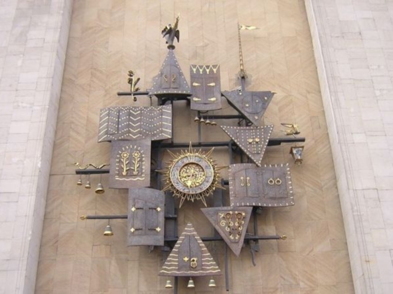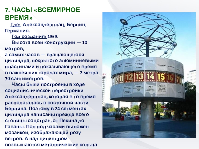 а самих часов — вращающегося цилиндра, покрытого алюминиевыми пластинами и показывающего время в важнейших городах мира, — 2 метра 70 сантиметров.