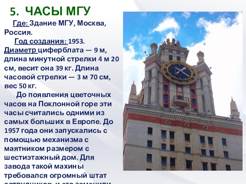 До появления цветочных часов на Поклонной горе эти часы считались одними из самых больших в Европе. До 1957 года они запускались с помощью механизма с маятником размером с шестиэтажный дом. Для завода такой махины требовался огромный штат сотрудников, и его заменили на электродвигатель.