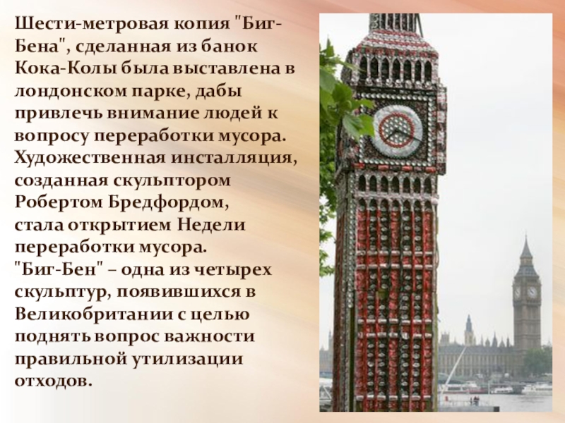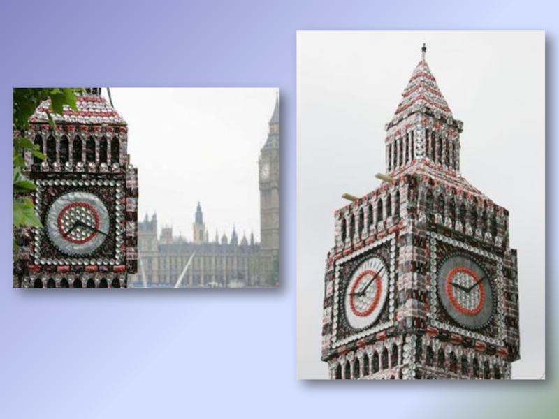 Слайд 26Шести-метровая копия "Биг-Бена", сделанная из банок Кока-Колы была выставлена в лондонском