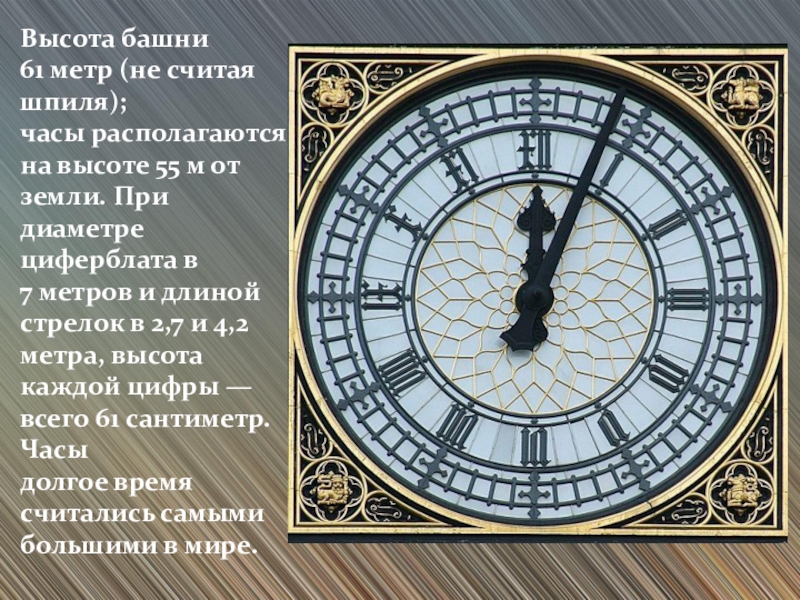 7 метров и длиной стрелок в 2,7 и 4,2 метра, высота каждой цифры — всего 61 сантиметр. Часы