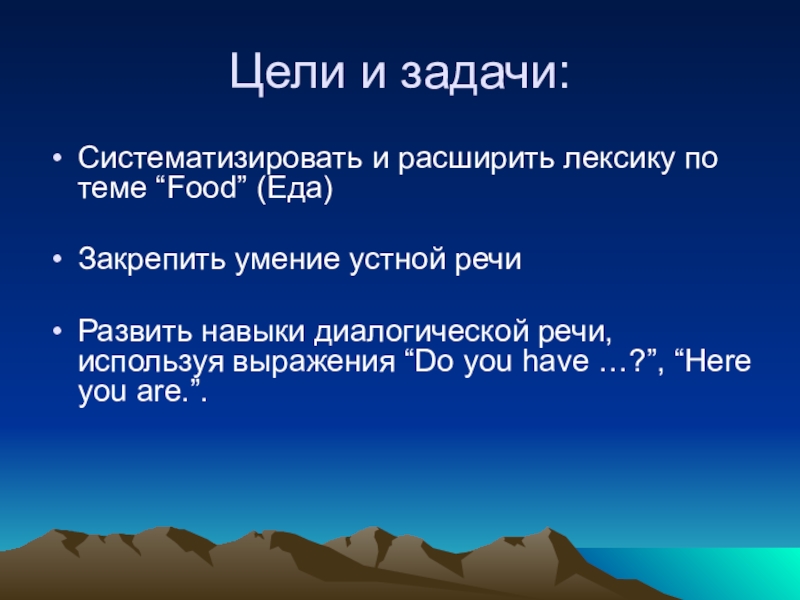 Цели и задачи:Систематизировать и расширить лексику по теме “Food” (Еда)Закрепить умение устной речиРазвить навыки диалогической речи, используя