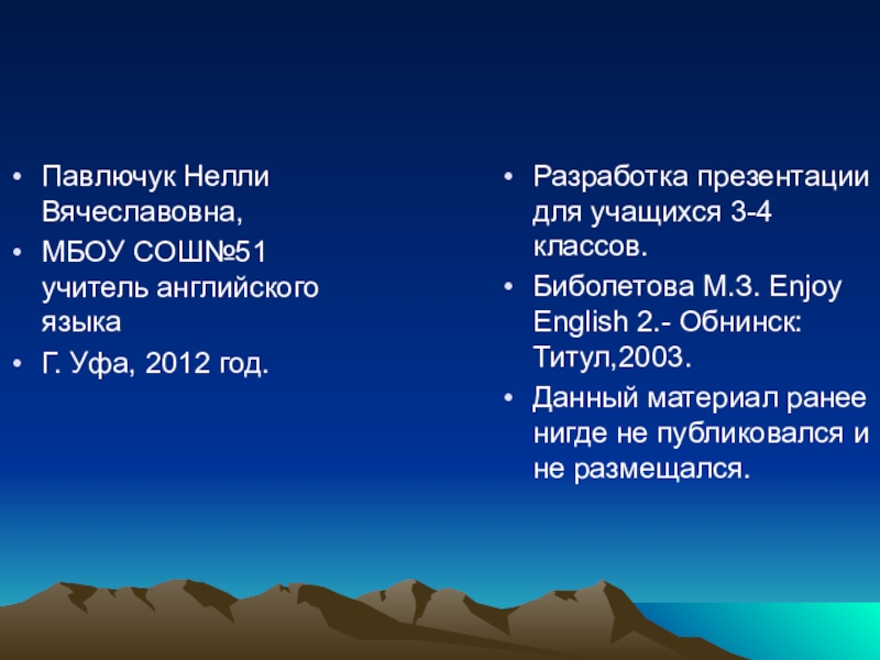 Павлючук Нелли Вячеславовна, МБОУ СОШ№51 учитель английского языкаГ. Уфа, 2012 год.Разработка презентации для учащихся 3-4 классов.Биболетова М.З.